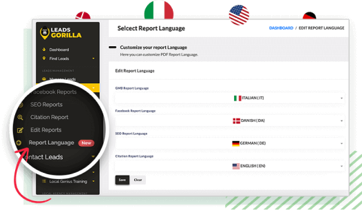 With LeadsGorilla, you can go way beyond just the English-speaking business sector. All our PDF reports are also available in: Dutch, Danish, Finnish, French, German, Italian, Polish, Greek, Spanish, Portuguese, Swedish, and Bulgarian.
